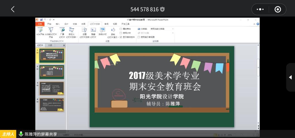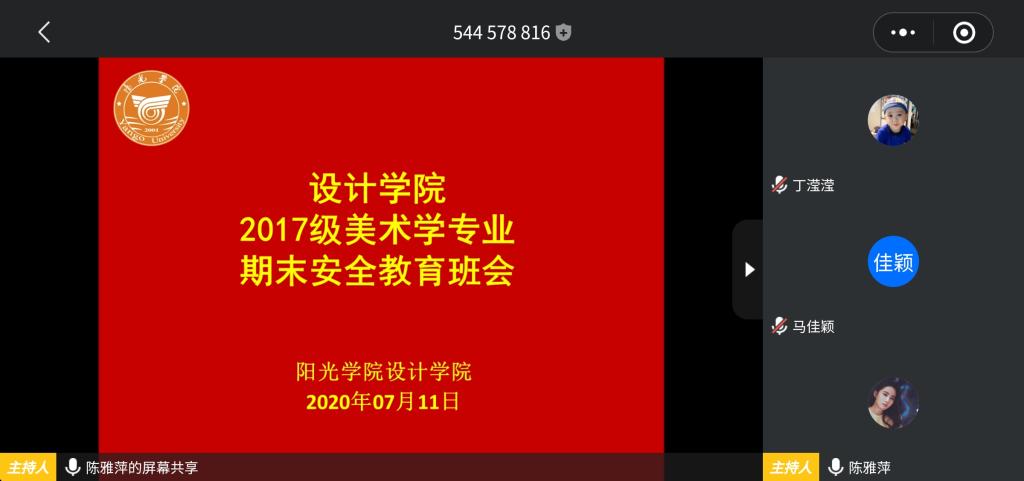 疫情期间,为使全体设计学院2017级美术学专业学生能在暑期继续保持对疫情防控的警惕,提高暑期安全防护意识,2020年07月11日,设计学院2017级辅导员陈雅萍老师面向全体美术学专业学生开展期末安全教育主题班会。会议内容包括期末安全教育、疫情防控工作、开学相关事宜、暑期社会实践和2021届考研工作等。