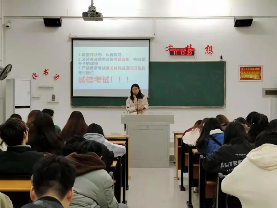 辅导员分享如何调整状态、积极备考。并带领同学们共同学习《学生手册》中关于考试违纪行为管理规定,并要求同学们要充分认识到考试的目的,端正考试态度,牢记考试作弊的严重性。希望同学们树立良好学风,确保考试质量,提高考试信誉,积极营造“公平、公正、诚实、守信”的考试氛围。
