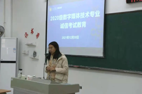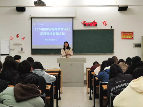 为进一步端正考风,严肃考纪,有效增强学生的诚信考试意识,杜绝和防范作弊现象,营造健康良好的考试氛围,引导学生牢固树立诚信考试,增强学生诚信意识,树立良好的学风,共创良好考试环境,2021年12月30日设计学院2020级数字媒体技术专业1班召开“文明考风,诚信考试”主题教育。会议由辅导员吴其枝老师主持。