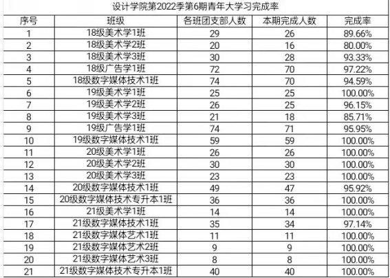 本周是共青团员进行第十三季第六期青年大学习,接下来看看设计学院各班级的完成情况吧。
