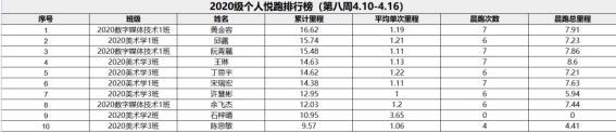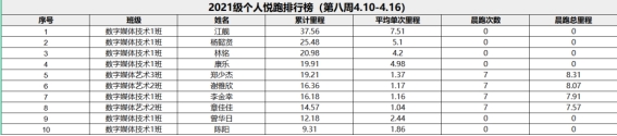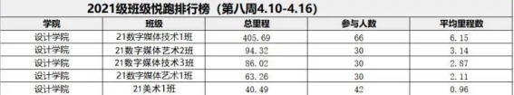 根据《阳光学院关于开展2022年悦跑排位赛的通知》,每周通过“步道乐跑”APP中显示的班级平均里程数,我院对本周参与悦跑的班级进行排名。现将2021级、2020级排名前5名的班级以及优秀悦跑个人公示: