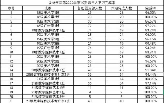 本周是共青团员进行第十三季第十期青年大学习,接下来看看设计学院各班级的完成情况吧。